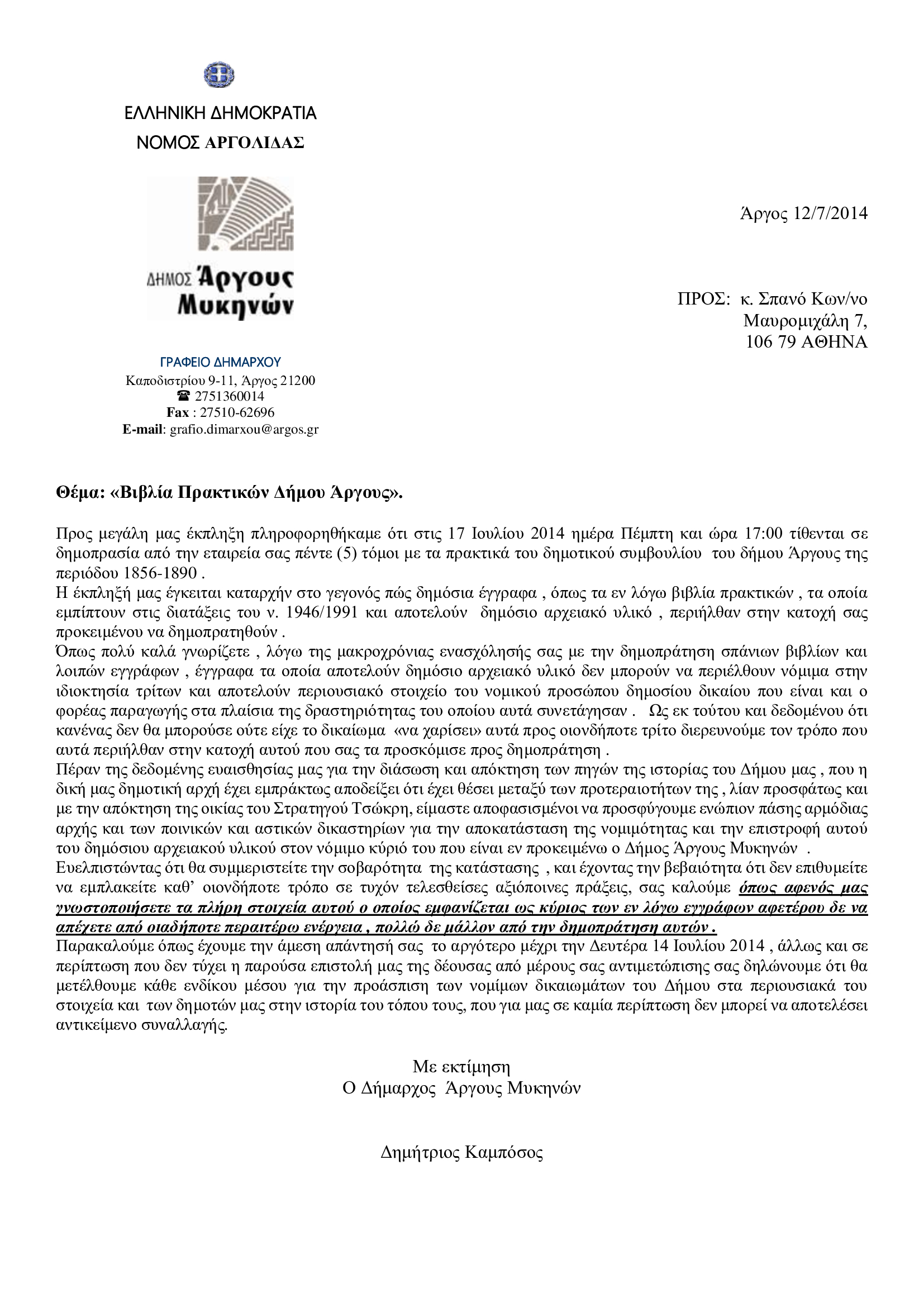 Ο Οίκος Δημοπρασιών σπάνιων βιβλίων, εγγράφων κλπ. Σπανός, δημοσιεύει πρόσκληση της 115ης δημοπρασίας για τις 17 Ιουλίου 2014. Μεταξύ των σπάνιων βιβλίων δημοπρατούνται πέντε τόμοι με τα χειρόγραφα πρακτικά του Δημοτικού Συμβουλίου του Δήμου Άργους των ετών 1856-1890. Στην ενότητα 38 (Πελοπόννησος) και στη θέση 420 (Δήμος Άργους) δίνονται οι απαραίτητες λεπτομέρειες για τους τόμους. Αμέσως, τόσο τα ΓΑΚ Ναυπλίου (διευθ. Δ. Γεωργόπουλος), όσο και εμείς (Γ. Γιαννούσης, Γ.Κόνδης, Οδ. Κουμαδωράκης) ενημερώνουμε τον τότε Δήμαρχο κ. Καμπόσο και δημοσιοποιούμε το θέμα στον τοπικό τύπο με επαναλαμβανόμενες ανακοινώσεις. Ο κ. Καμπόσος βρήκε βολική την ευκαιρία να βασιστεί στο έγγραφο του διευθυντή των ΓΑΚ (αρ. πρωτ. 278/9-7-2014) και να αρχίσει μια απίθανη σταυροφορία πολιτισμού! Θα πρέπει να μείνει στην ιστορία της Τοπικής Αυτοδιοίκησης η επιστολή που δημοσιεύει στον τοπικό τύπο για την αμετροέπεια και την πολιτιστική αερολογία Δημάρχου ο οποίος δεν έπραξε το παραμικρό για την πολιτιστική ανάπτυξη της … «πόλης Του», όπως του άρεσε να λέει.